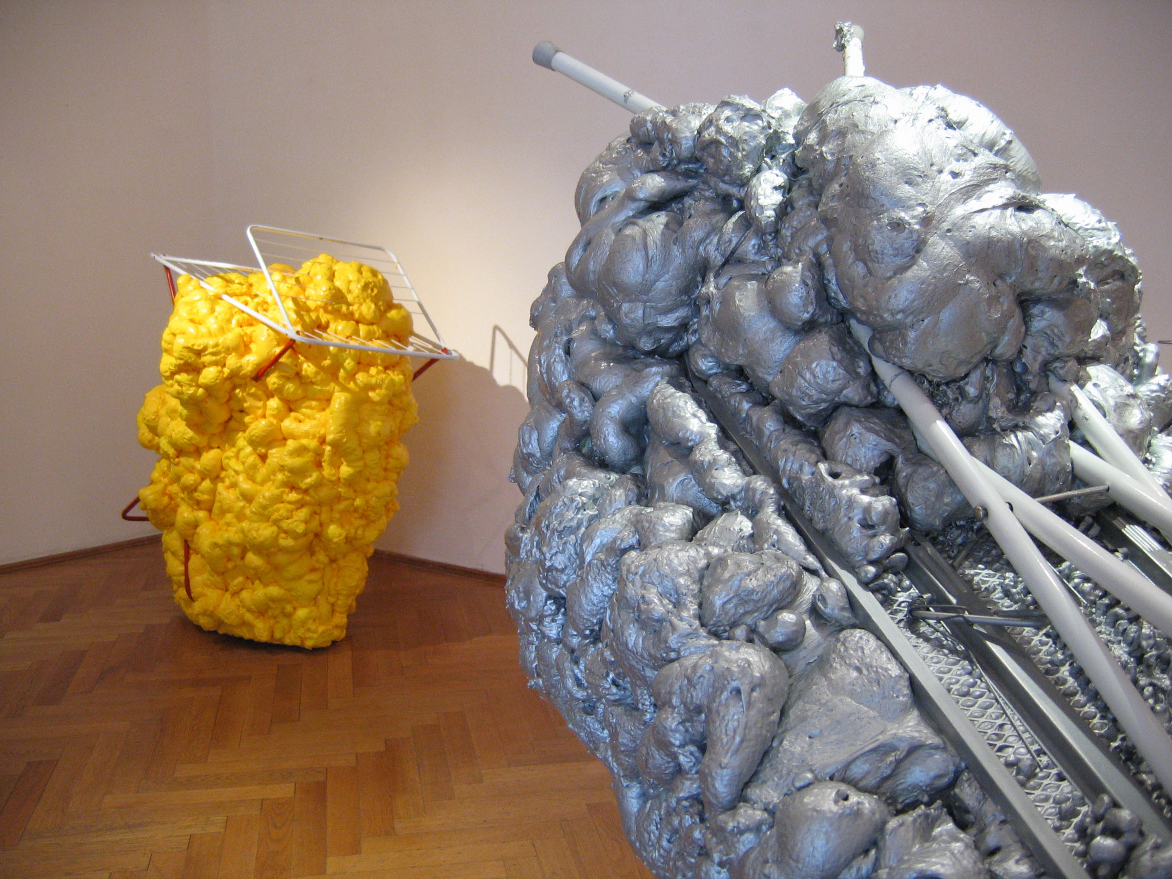 © Wilhelm Roseneder. Silberne Erweiterung/Silver expansion, 2006/2007. Bügelbrett, Styropor, Plastikflaschen, Klebeband, Verpackungsmaterial, Polyurethan, Lack/Ironing board, styropor, plastic bottles, sticky tape, packing materials, polyurethane, varnish, 1.40x1.50x90 cm. Gelbe Erweiterung/Yellow expansion, 2006/2007. Wäschetrockner, Styropor, Plastikflaschen, Klebeband, Verpackungsmaterial, Polyurethan, Lack/Airiel drier, styropor, plastic bottles, sticky tape, packing materials, polyurethane, varnish, 1.26x1.23x90 cm
