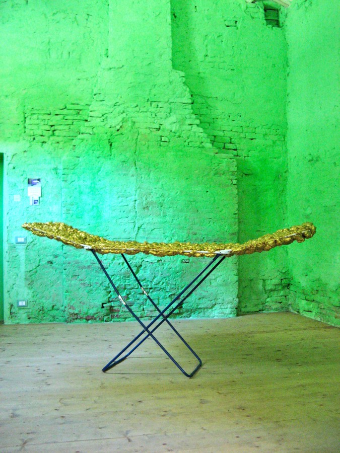 © Wilhelm Roseneder. Goldene Erweiterung II/Golden expansion II, 2009. Polyurethan, Acryllack auf Metall (Wäschetrockner)/Polyurethane, acrylic varnish on metal (clothes-dryer), 1.92×1.07×60 cm. Artfarm Pilastro. Pilastro di Bonavigo, Verona, Italy 2011