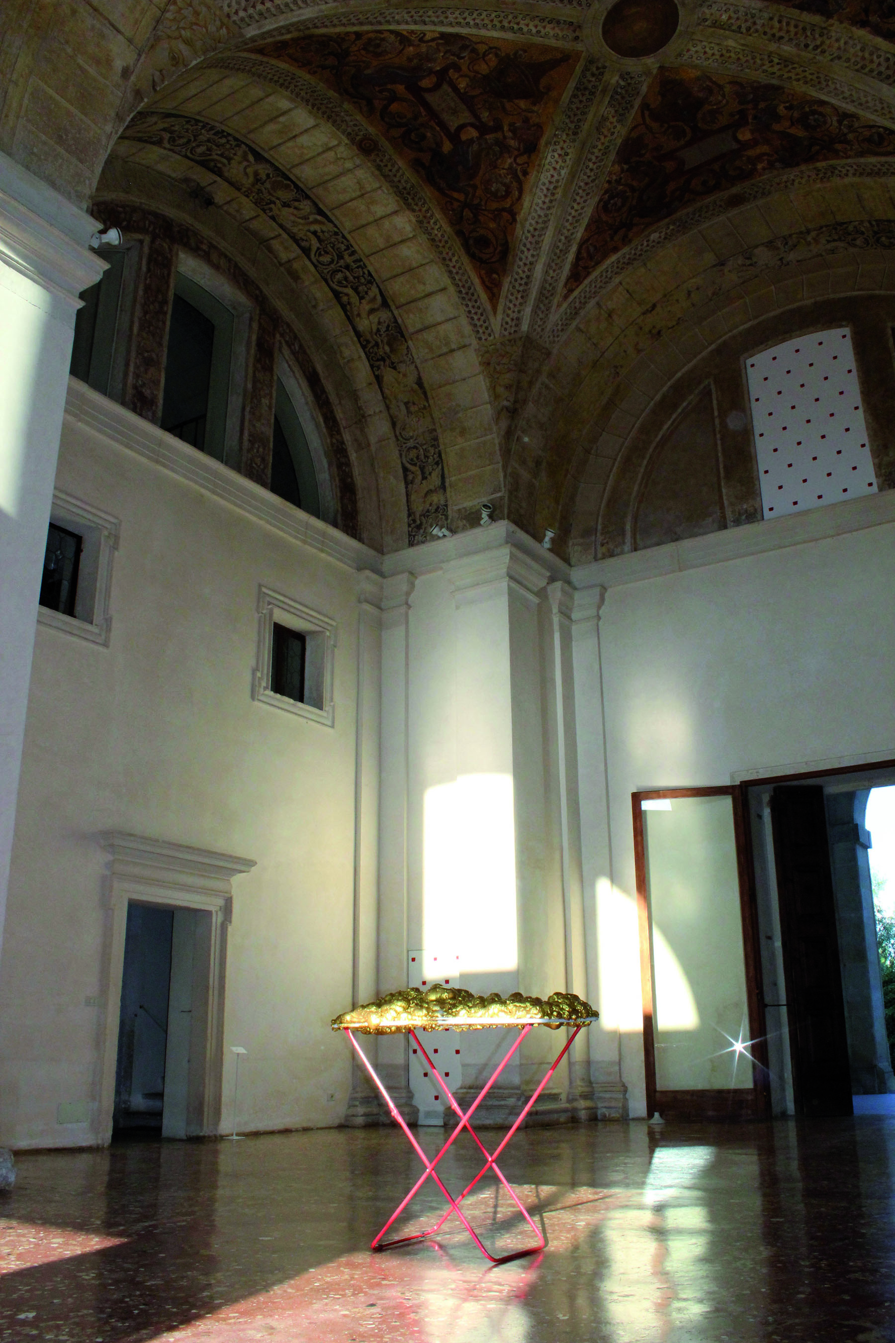 © Wilhelm Roseneder. Goldene Erweiterung/Golden expansion, 2005/2009. Villa Pisani Bonetti. Vicenza, Italy 2012. Skulptur. Polyurethan, Acryllack auf Metall (Wäschetrockner)/Sculpture. Polyurethane, acrylic varnish on metal (clothes-dryer), 1.11×1.12×60 cm