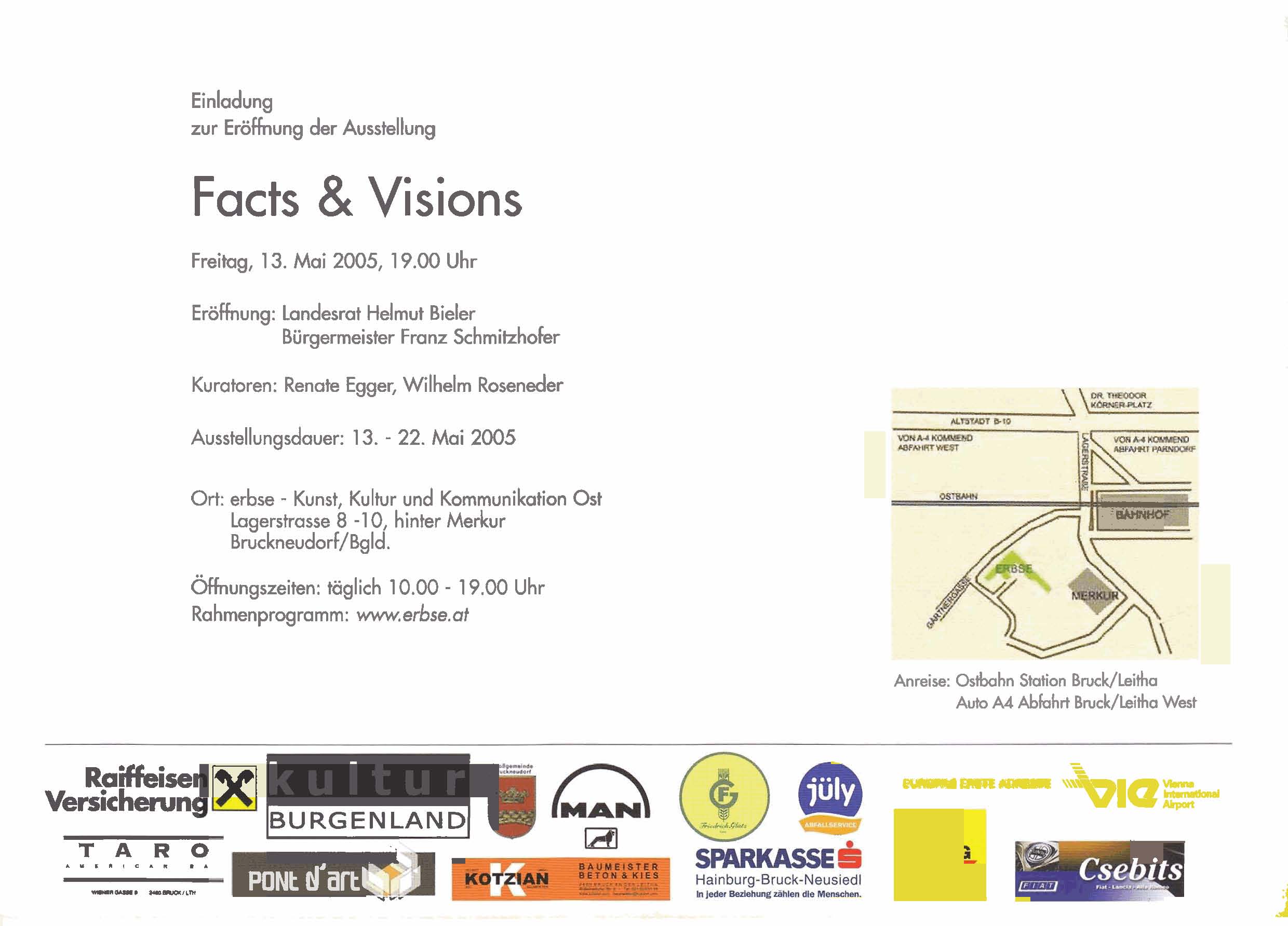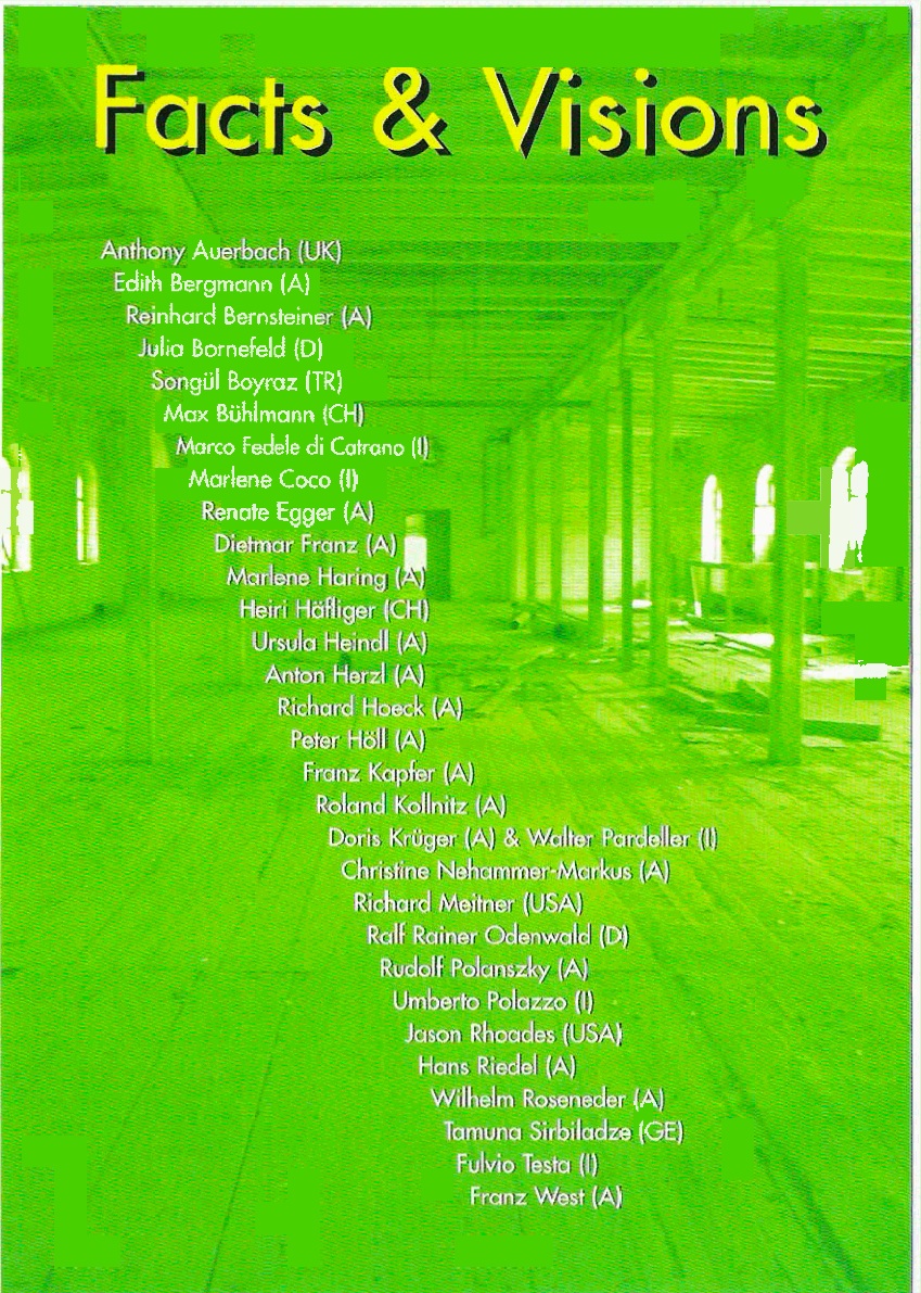 2005 „Facts & Visions“. Erbsenschälfabrik, Bruckneudorf, Austria. 31 national und international artists: Anthony Auerbach (UK), Edith Bergmann (A), Reinhard Bernsteiner (A), Julia Bornefeld (D), Songül Boyraz (TR), Max Bühlmann (CH), Marco Fedele di Catrano(I), Marlene Coco (I), Renate Egger (A), Dietmar Franz (A), Marlene Haring (A), Heiri Häfliger (CH), Ursula Heindl (A), Anton Herzl (A), Richard Hoeck (A), Peter Höll (A), Franz Kapfer (A), Roland Kollnitz (A), Doris Krüger (A) & Walter Pardeller(I), Christine Nehammer-Markus (A), Richard Meitner (USA), Ralf Rainer Odenwald (D), Rudolf Polanszky (A), Umberto Polazzo (I), Jason Rhoades (USA), Hans Riedel (A), Wilhelm Roseneder (A), Tamuna Sirbiladze (GE), Fulvio Testa (I), Franz West (A)