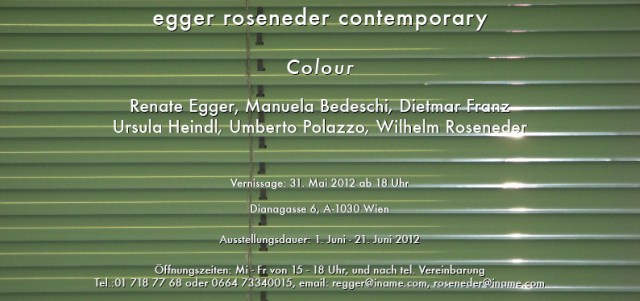 2012 Colour. Fotografie, Skulptur, Malerei, Installation, Zeichnung/Photography, sculpture, painting, installation, drawing. Renate Egger, Manuela Bedeschi, Dietmar Franz, Ursula Heindl, Umberto Polazzo, Wilhelm Roseneder. egger roseneder contemporary. Vienna, Austria