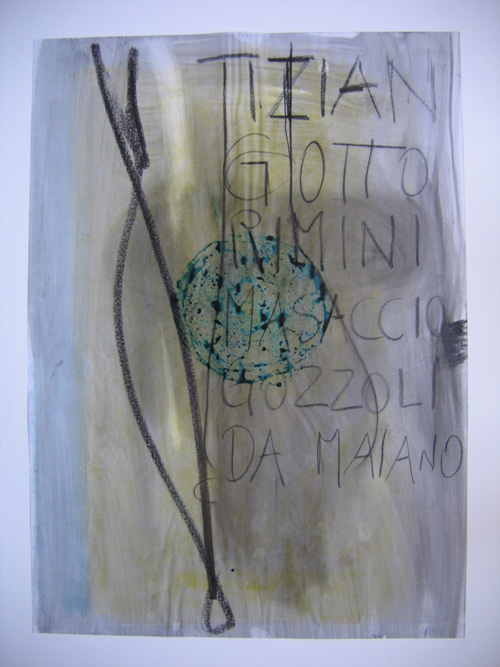 Wilhelm Roseneder. Tizian, Giotto, Rimini, Masaccio, Gozzoli, Da Maiano. 1990. Glasochrom auf Paraffinpapier/Glasochrom on paraffin-paper, 63×45,5 cm