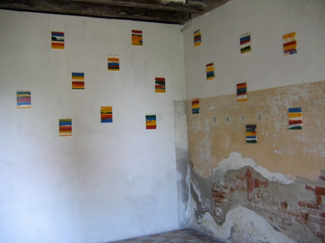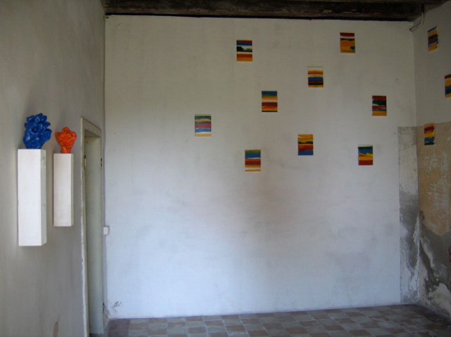 Wilhelm Roseneder. Items 1-17, 2006. Lack auf Leinen/Varnish on canvas, 24×18 cm. Großer blauer Kunstgriff, 2003. Orangener Kunstgriff, 2004. Ungebrannter Ton, Lack, Konsole/Varnish on non-fired clac, console, ca. 20 cm high. Pilastro di Bonavigo, Verona, Italy, 2006