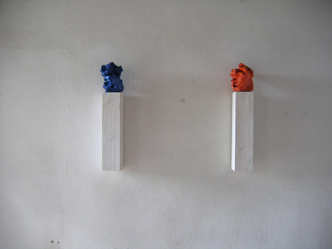 Wilhelm Roseneder. Großer blauer Kunstgriff, 2003. Orangener Kunstgriff, 2004. Ungebrannter Ton, Lack, Konsole/Varnish on non-fired clac, console, ca. 20 cm high. Pilastro di Bonavigo, Verona, Italy, 2006