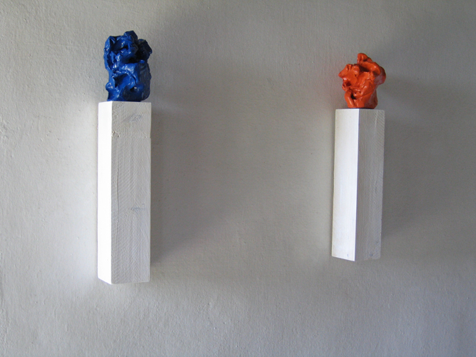 © Wilhelm Roseneder. Großer blauer Kunstgriff, 2003. Orangener Kunstgriff, 2004. Ungebrannter Ton, Lack, Konsole/Varnish on non-fired clac, console, ca. 20 cm high. Artfarm Pilastro. Pilastro di Bonavigo, Verona, Italy, 2006