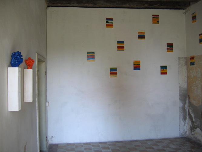 © Wilhelm Roseneder. Items 1-17, 2006. Lack auf Leinen/Varnish on canvas, 24×18 cm. Großer blauer Kunstgriff, 2003. Orangener Kunstgriff, 2004. Ungebrannter Ton, Lack, Konsole/Varnish on non-fired clac, console, ca. 20 cm high. Pilastro di Bonavigo, Verona, Italy, 2006